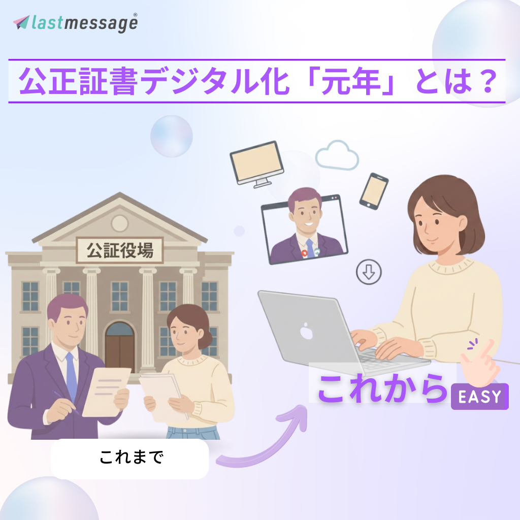 2020年遺言書のDXに向けた「ネット遺言*」の先駆けとしてlastmessage サービスの提供を開始しました。現在は『ネット遺言*だけではなく正式な遺言書もDXできないか。』というニーズを受けて公正証書遺言の原案が作成できる、lastmessage 「1人でできる!公正証書遺言」も備わりました。