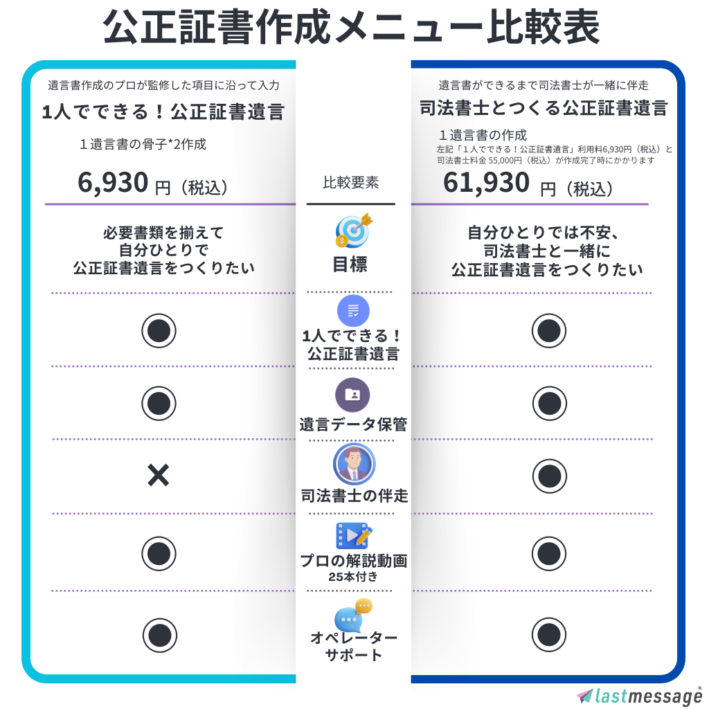 lastmessage と類似の各社遺言サービスを表で比較いただけます。